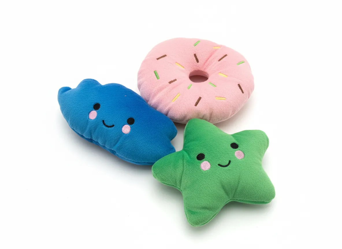 Набір з 3 плюшевих іграшок: синя хмаринка з щічками, рожевий пончик з присипкою, зелена зірка з посмішкою. М'які, для цуценят.